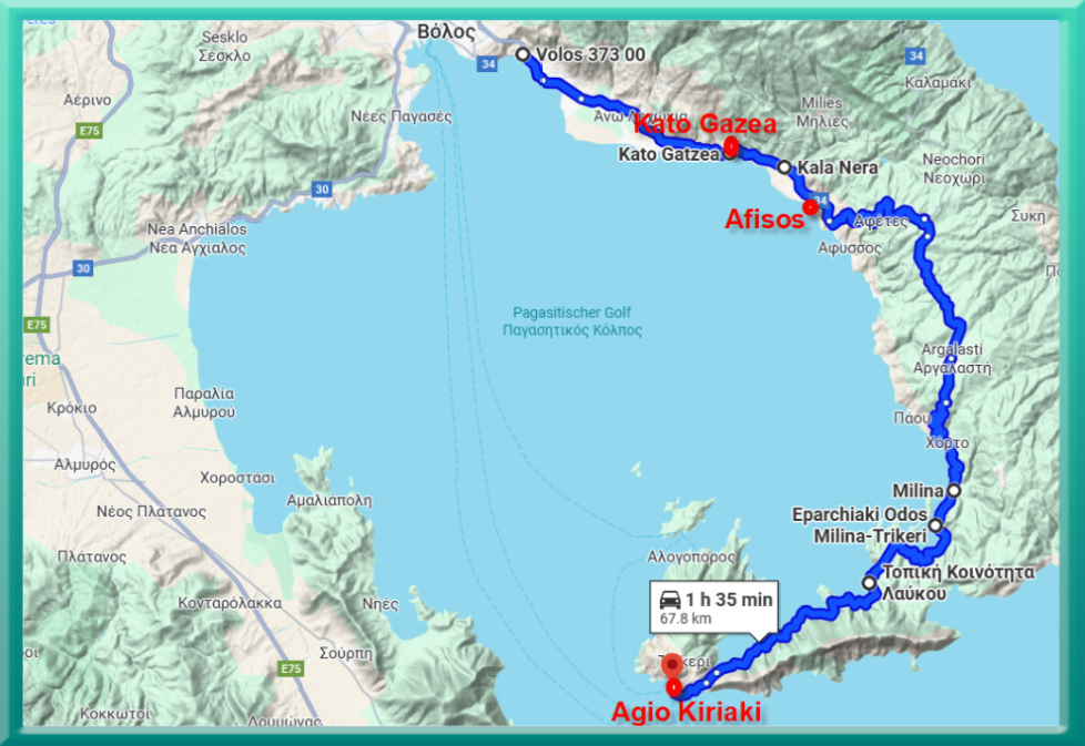 Unser nächstes Ziel ist die Halbinsel Pilion, die durch das mächtige Pilion Gebirge vom Festland abgegrenzt wird. An der höchsten Stelle, dem Chani Pass auf 1‘200m gibt es sogar einen Skicenter! Wir haben aber heute keine Bergtour im Sinn sondern lassen uns von Steffi auf der E92 entlang des Flusses Pinios zwischen grossen Baumwollfeldern via Trikala, Larisa und Volos zum hübschen Fischerdorf Kato Gatzea leiten. Dieses liegt an einer schönen Bucht am pagasitischen Golf, Camper sind beim kleinen Hafen willkommen. An der Uferstrasse der Bucht gibt es Tavernen und Restaurants, beim Hafen einen Bootsverleih. Wir parkieren am Strand und genehmigen uns ein Vesper in einer Taverne. Nach einer Siesta im Wimo spielen wir abends noch eine Runde Quass; ich gewinne sogar einmal von 3 Spielen.